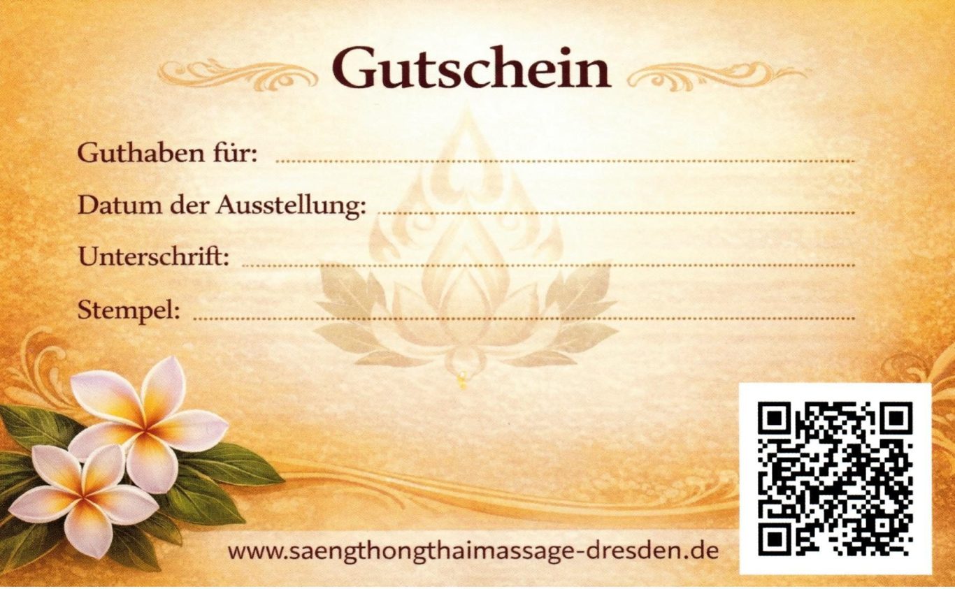 Mit einem Gutschein von Saengthong Thaimassage verschenken Sie mehr als nur eine Massage – Sie schenken eine Auszeit vom Alltag.